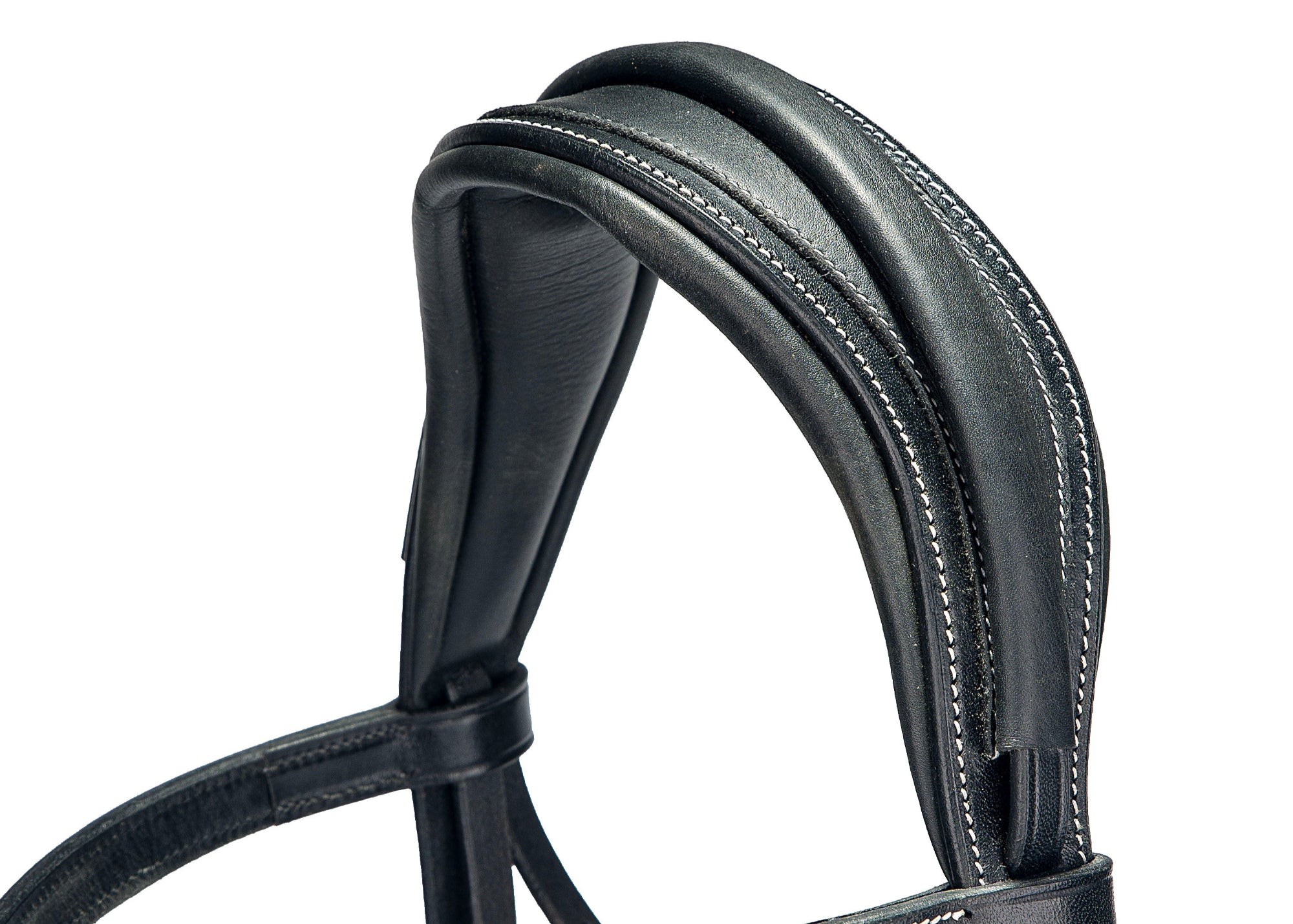 This SALE bridle has a comfortable crown with thicker padding on either side of the pole to reduce the pressure on top. The comfortable noseband had a nicely padded crank buckle system with slots to keep the chin pad in line. The raided fancy stitched browband completes the classic look.