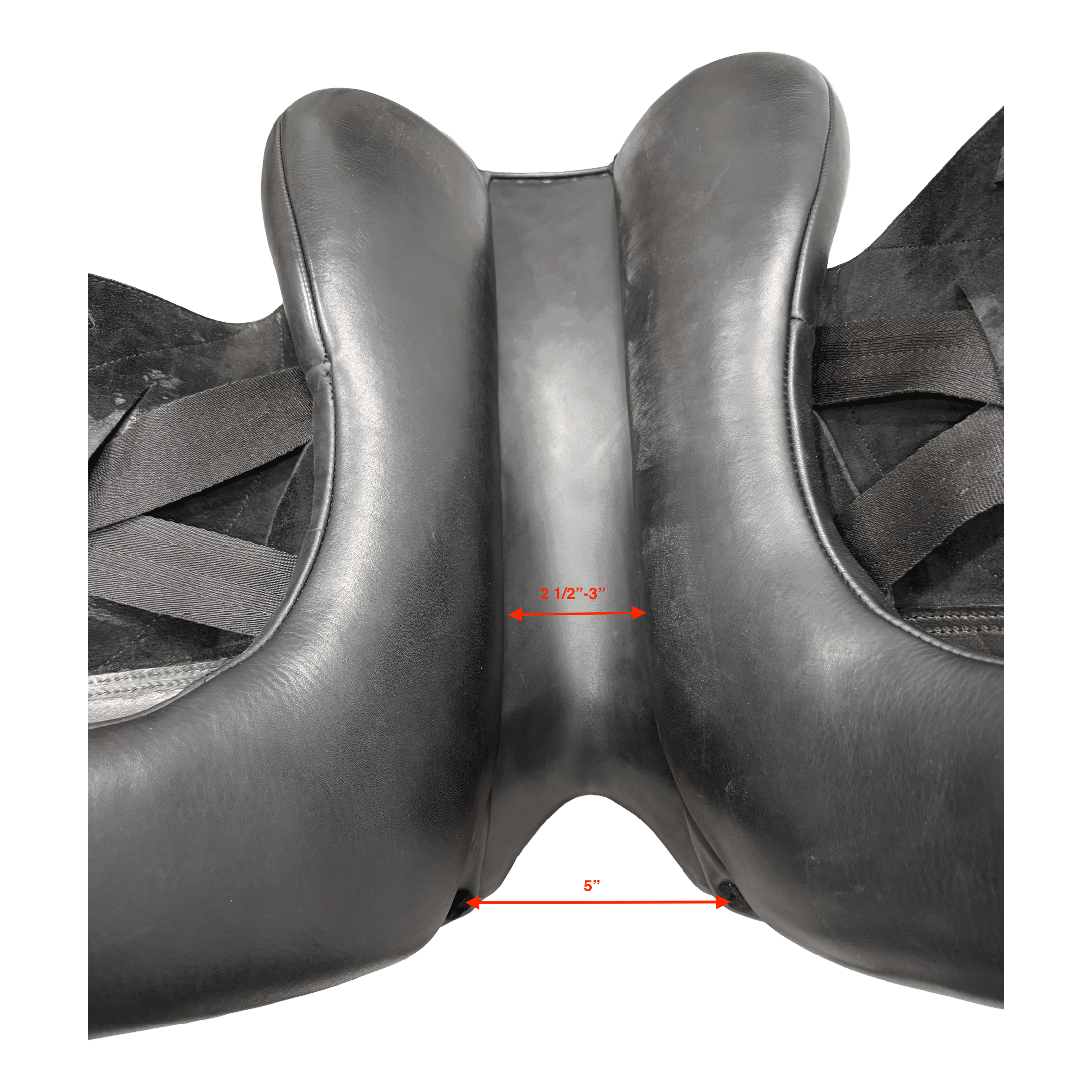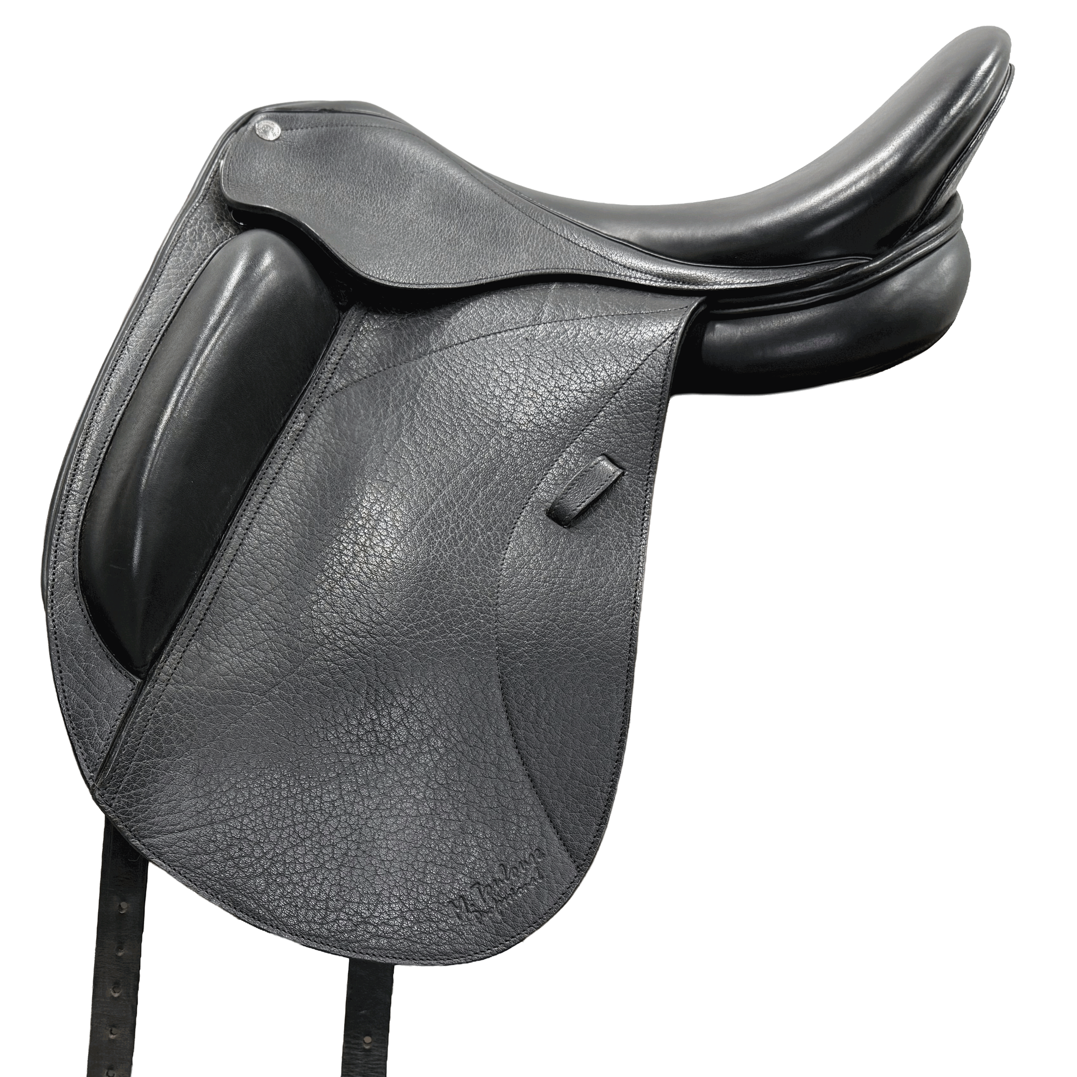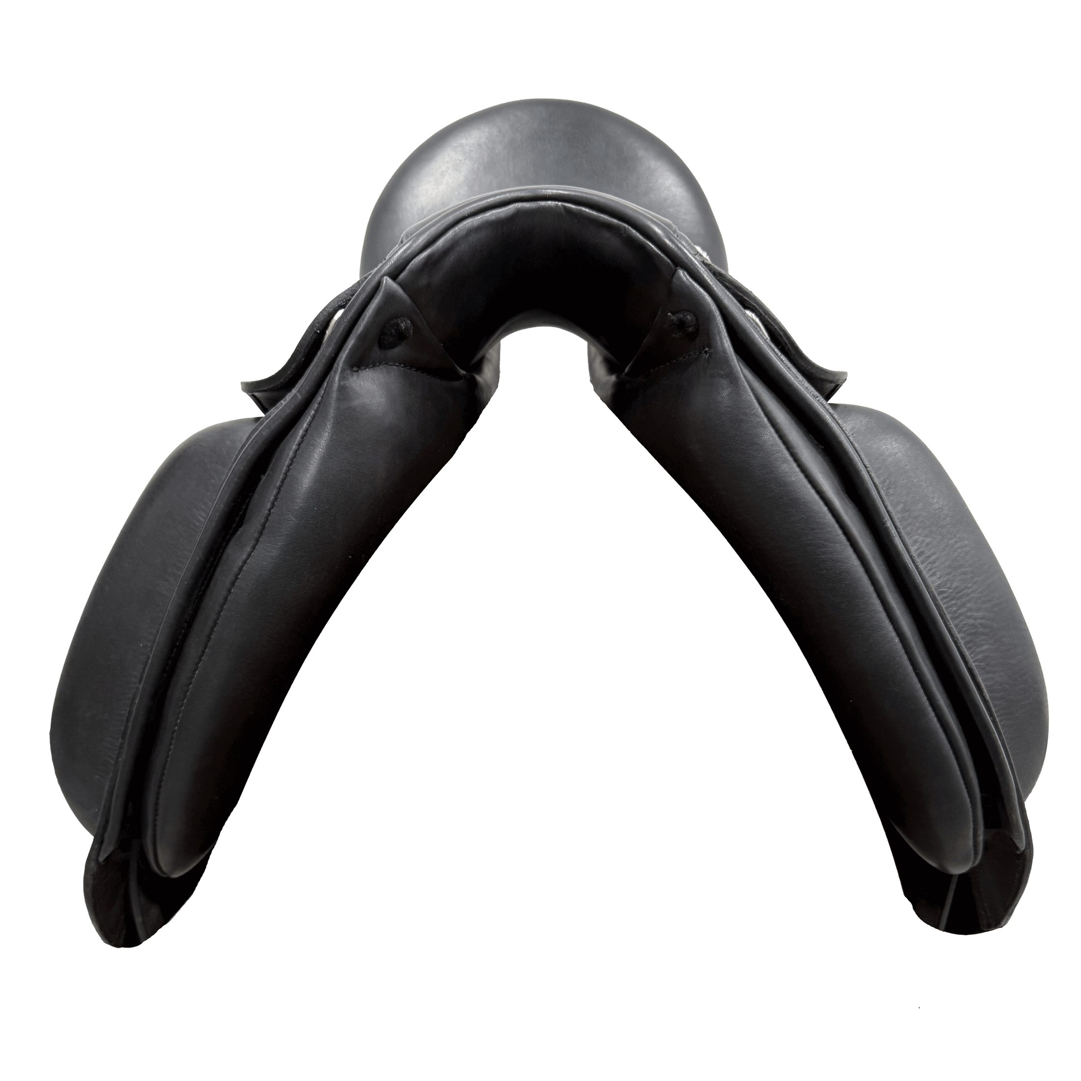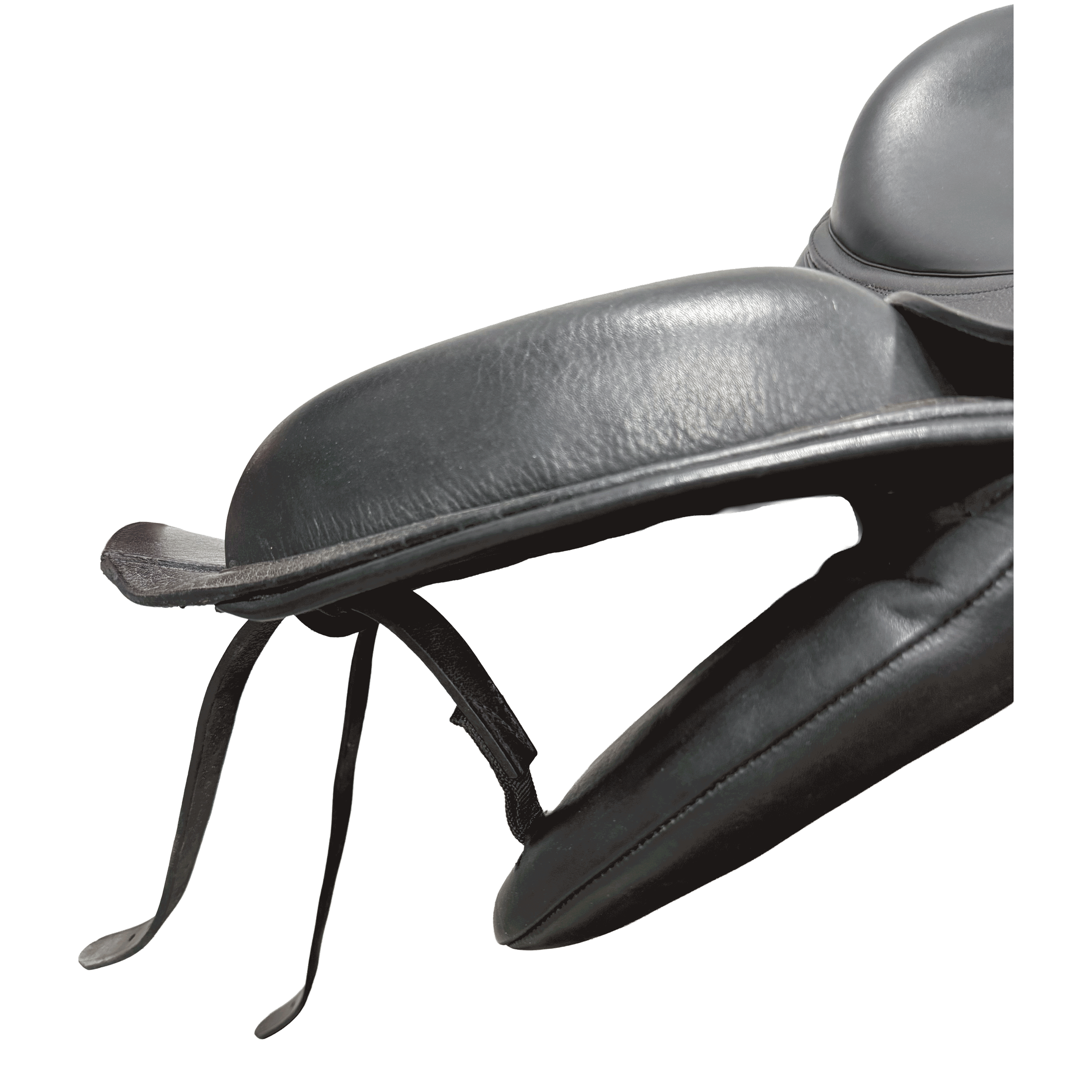 SAMPLE SALE! This Serafina Dressage Saddle is an early sample made for test riding without the Genesis Tree. The Serafina tree was developed for M. Toulouse to our dressage riders specifications. The narrow twist is preferred by many riders. Large, medium length knee roll provides stability and comfort. The mono-flap design point billet comes directly from the front panel secured with a strap/channel on the underside of the flap.